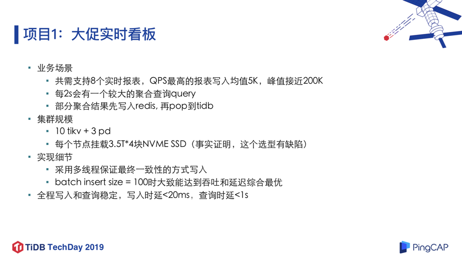 当时该项目下一共有 8 个实时报表,QPS 写入均值 5K,大促活动开始时 QPS 峰值接近 200K/秒,每过 2s 会有较大的聚合查询 query,聚合结果还需要写入 Redis 再 pop 到 TiDB,集群规模方面只用了 10 个 TiKV 和 3 个 PD。还有一点值得提一下,当时每个节点挂了 3.5T * 4 块的 NVME SSD,但是后来事实证明这个选型是有问题的,因为大促的时候我们人人都在盯着,磁盘坏了会立刻得到解决,所以即使把四块盘做了 raid0,然后上线了,根本无法确定 NVME 盘出问题的概率是多少,后来差不多每个月会出现一两次类似的故障,故障率很高,虽然我相信未来 NVME 会做得更好,但这样高的故障率从设计角度来看,这个选型就未必是最合适的。