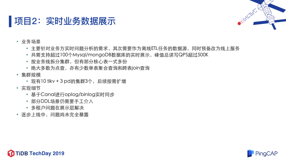 在实践细节上,首先我们会基于 Canal 去做 oplog/binlog 的实时同步。其次,目前我们对加列之外的 DDL 支持得不够好,这部分还需要 DBA 手工介入,但在未来会有一些改进。最后是多租户问题,比如判断某个部门的同事是否有权限访问另一个部门的数据库,这件事在线上会非常头疼,现在在接入层解决这个问题,我们内部有一个叫 venus 的展示平台,将上层全链控制、认证等事情去掉,所以我们就不用关注这件事了,至少眼下不用关注。这个项目已经开始逐步上线,基本上架构已经确定。