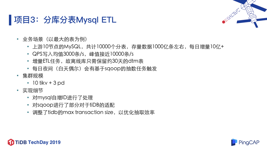这个场景下的第一个项目是做分库分表的 MySQL ETL。以最大的表为例,上游 10 节点的MySQL,共计 10000 个分表,存量数据 1000 亿条左右,每日增量 10 亿+,QPS 写入均值 3000 条/s,峰值接近 10000 条/s,平台促销活动对这部分影响也不大,甚至反而会降低,因为活动主要是电商部门在做,社区的查询需求反而变少。我们在 TiDB 离线库保留了大约 30 天增量监控数据,全量数据存在 S3 上,每日夜间(白天偶尔)会有基于 sqoop 的抽数任务触发。集群规模方面,目前使用 10 节点 TiKV + 3 节点 PD。