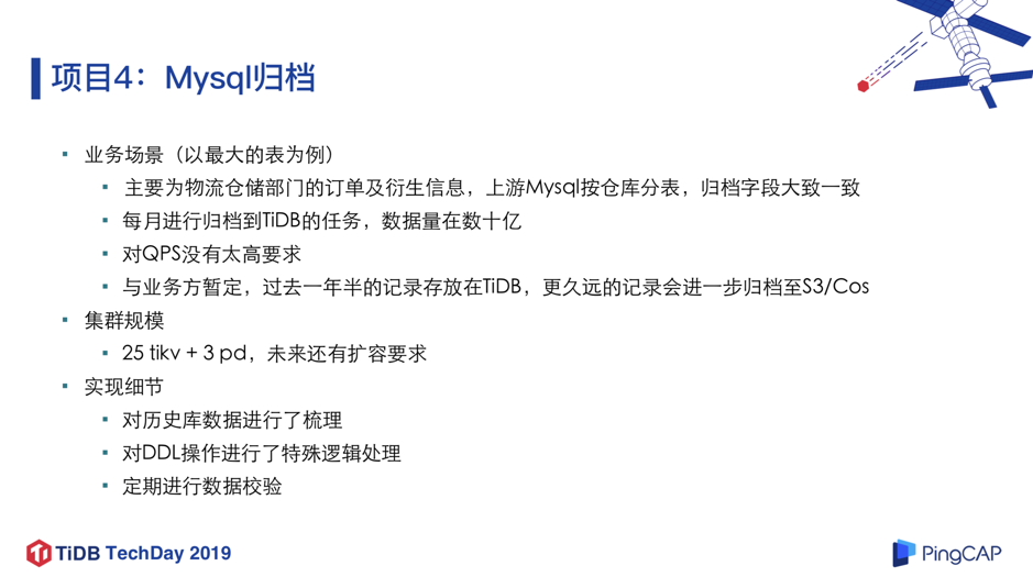 项目 4 MySQL 归档是基于项目 3 的演进。业务背景方面,以最大的表为例,主要为物流仓储部门的订单及衍生信息,存量非常非常大,每月进行归档到 TiDB 的数据有数十亿,但对 QPS 要求不是很高,与业务方讨论之后暂定,过去一年半的记录存放在 TiDB 供业务方查询,更久远的记录归档到 S3/Cos 上。