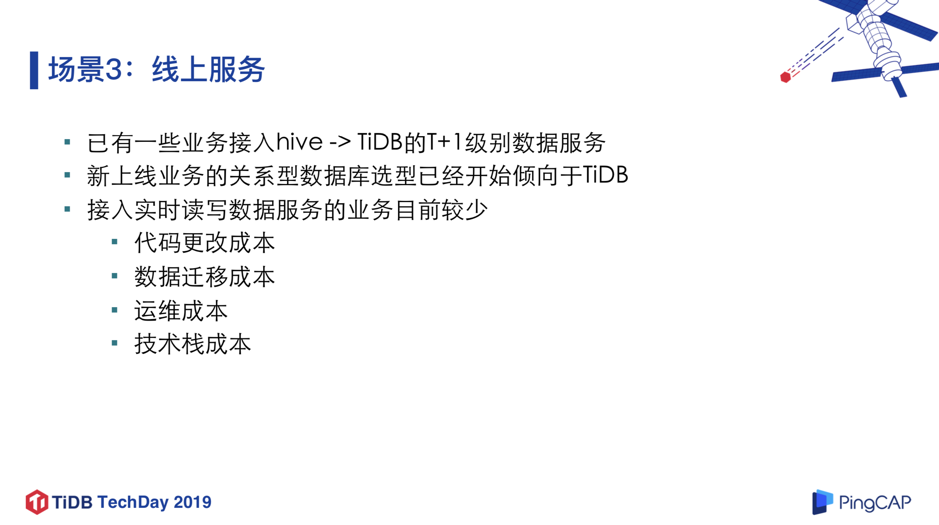 现在我们已经有一部分线上业务从 Hive 离线导入到 TiDB 做 T+1 级别数据服务,而且我们新上线业务的关系型数据库选型已经开始倾向于 TiDB,主要是因为它的扩展性为我们节省了很大的时间成本,尤其是业务增长比较快的情况下,选择 MySQL 分库分表其实是一件代价极其大的事情。