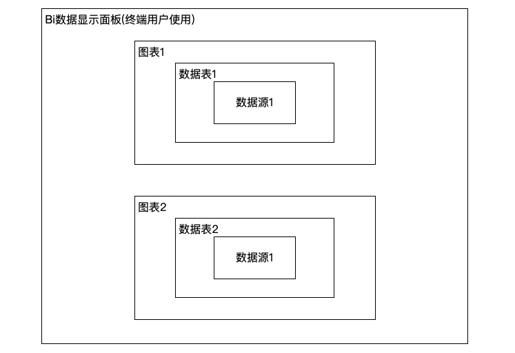 bi数据显示面板由数据图表组成,数据图表里的数据来自数据库里的表,数据库里的表来自配置的数据源,关系如下所示