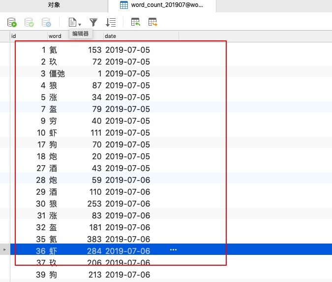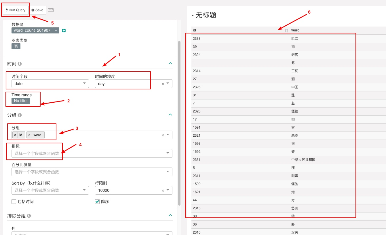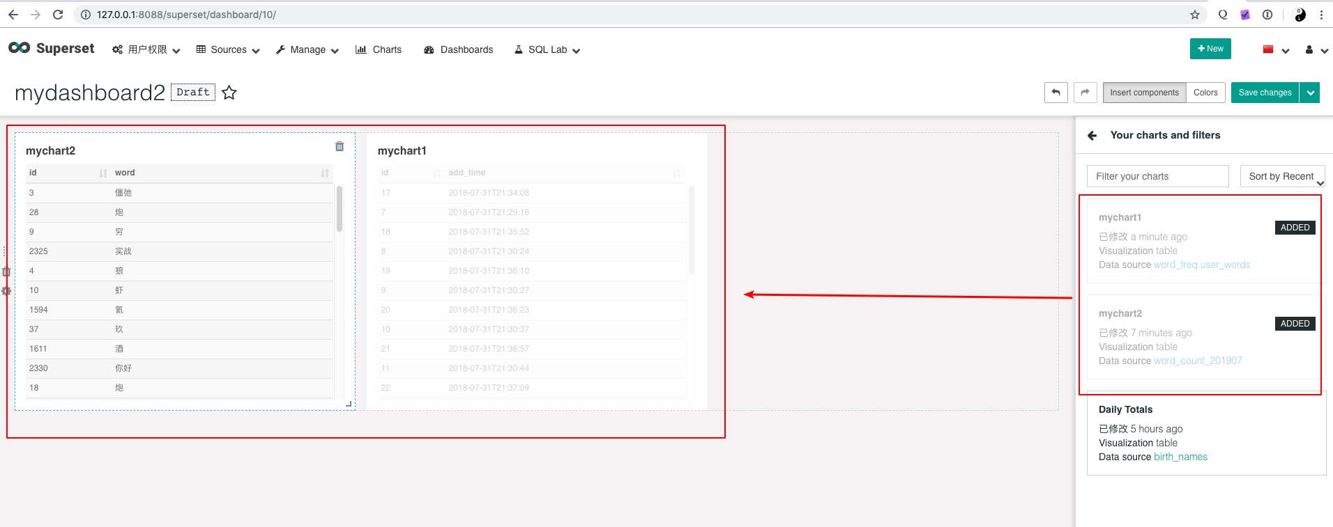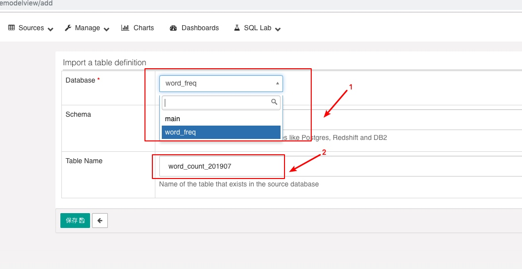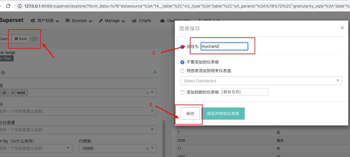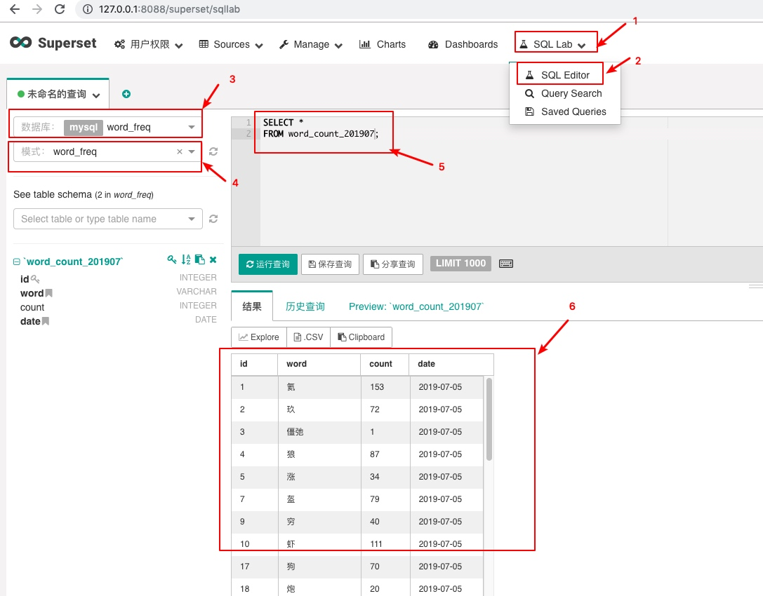 在superset中有了数据表后,就可以从这个数据表读取数据生成图表了 比如从下面这个mysql的word_freq表中生成图表
