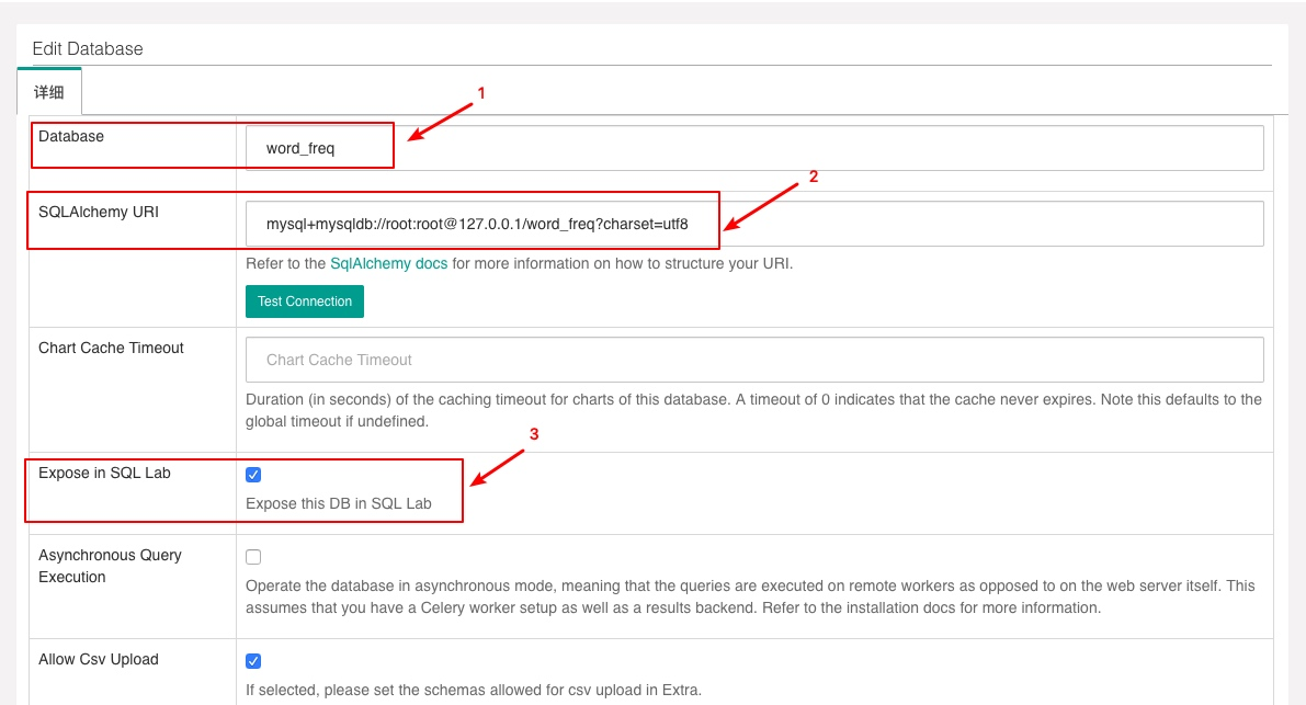 可选:Expose in SQL Lab单选表示是否可以在Sql Editor调试这个数据源,建议勾上