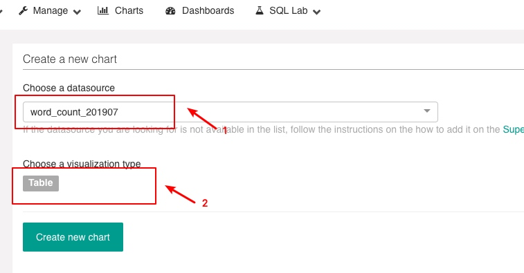 数据源建好后,只是表示有可选的数据使用了,具体使用数据源中的那张表需要在superset中创建数据表来表示
