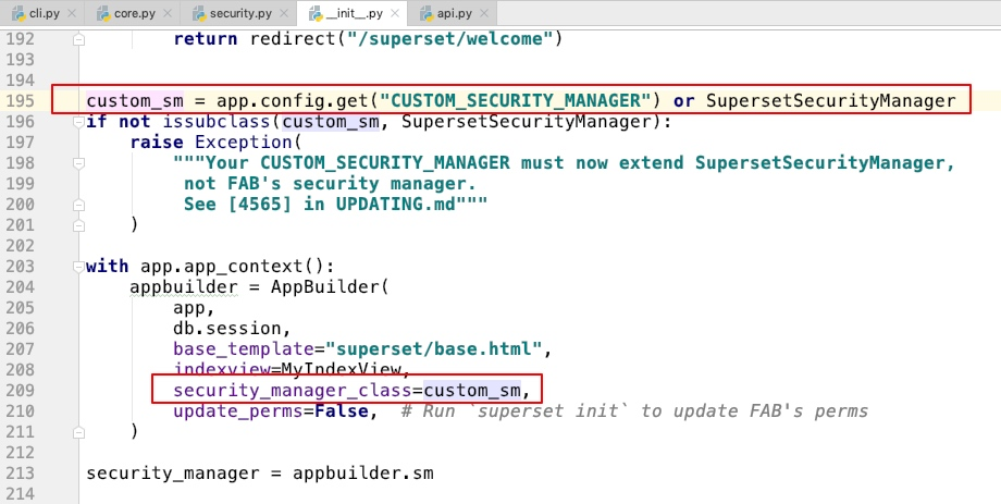 superset使用flask内置的has_access, has_access_api装饰实现权限检查 在incubator-superset/superset/security.py中继承了flask默认的权限处理,并在/incubator-superset/superset/init.py注册成了默认的权限处理器