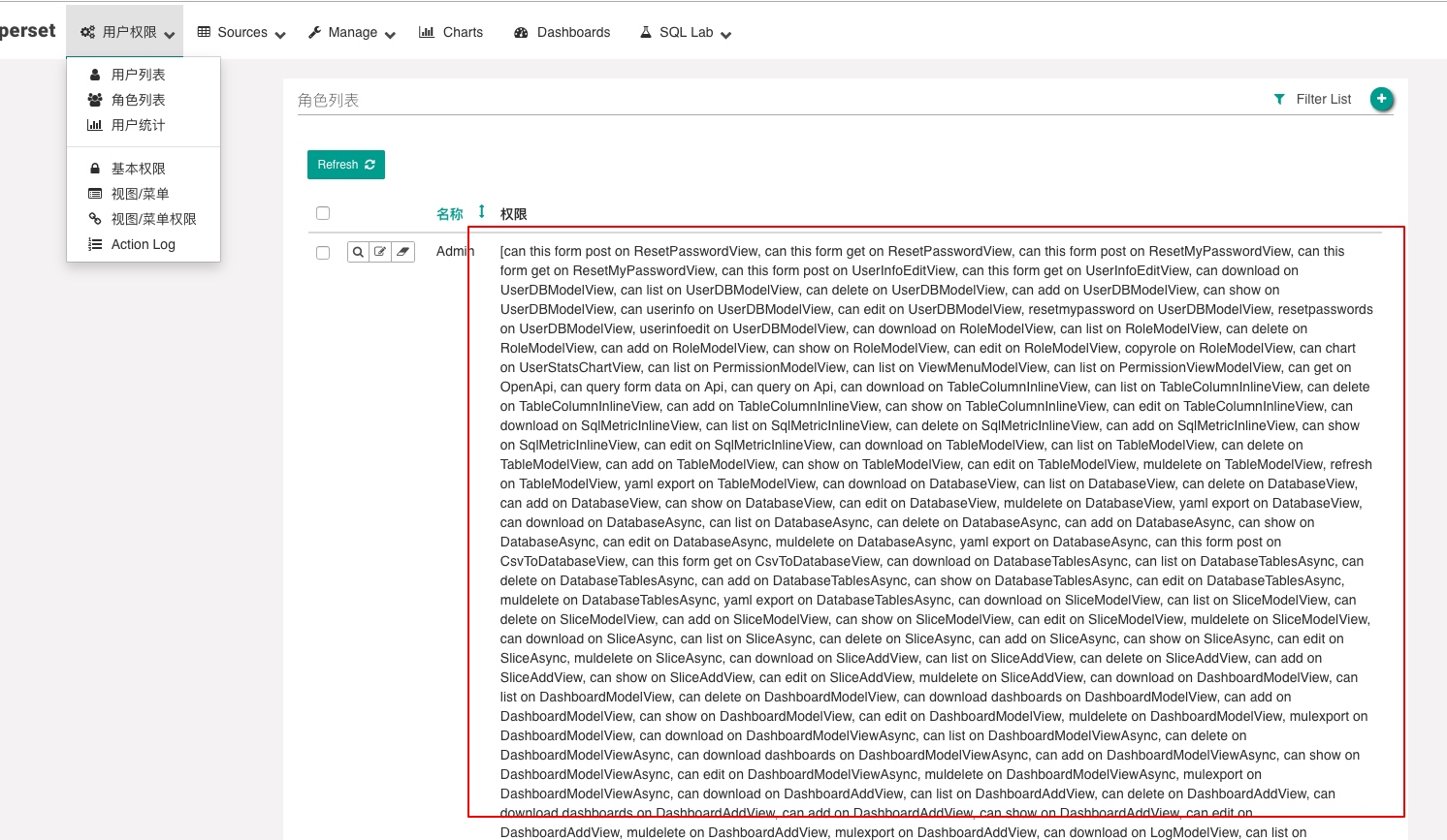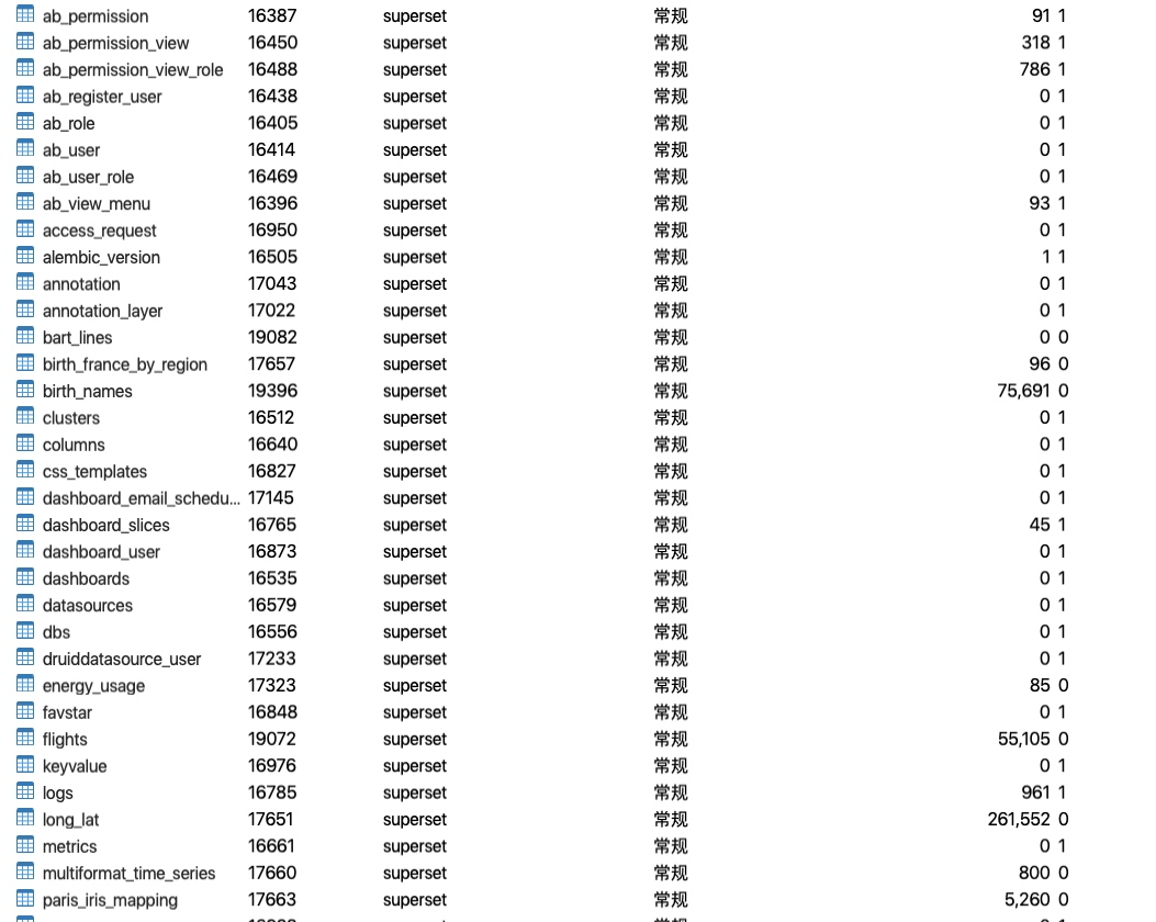 可以看到这个superset提供了一大堆内置的权限可以使用,权限涉及到两张表:ab_permission、ab_view_menu