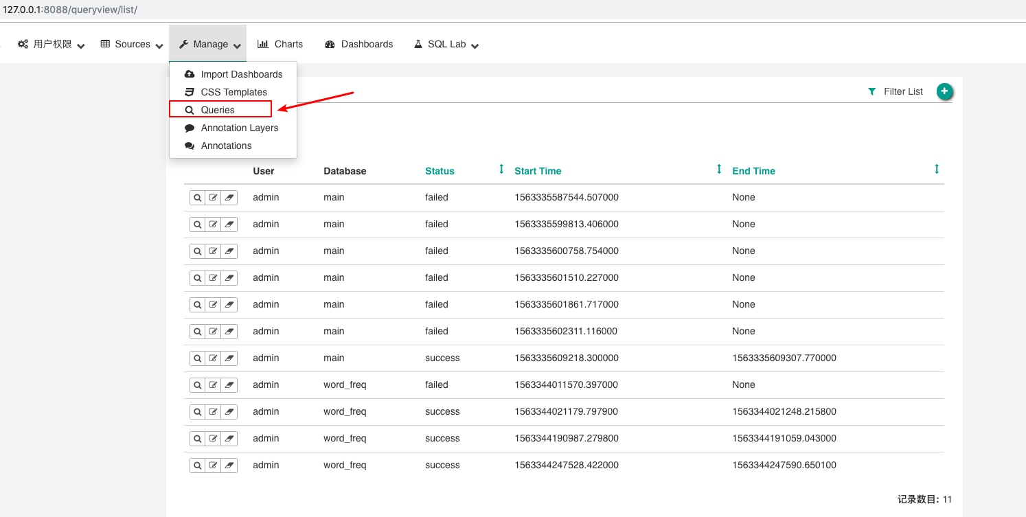 可以在"Manage" > "Queries"中查看到执行过的sql语句列表,详情就是具体的sql语句了,显示效果如下