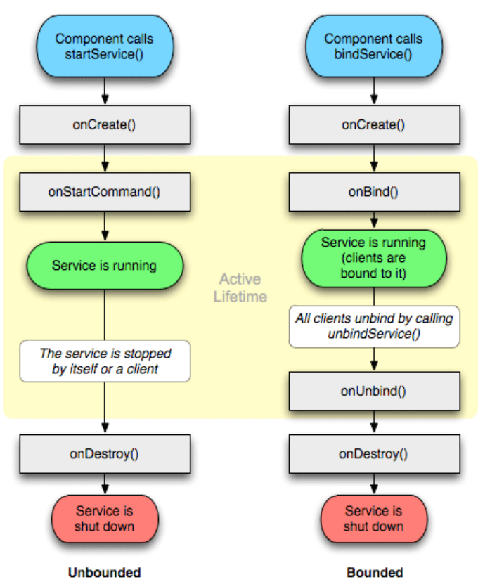 - 如果service是被绑定的,它们它的活动生命周期是在onUnbind()方法返回后结束。