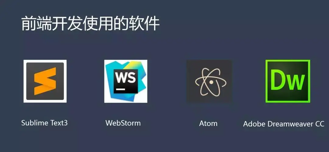 前端开发是代码编程工作,在学习过程中,会接触到很多编辑软件,如:sublime,WebStorm,Atom,DW,这类软件都具备代码编辑的功能,功能上都差不多。做编程开发工作,代码好比我们做菜的原料,编辑软件就好像炒菜的锅。不管什么锅都可以炒出菜,只是你用的习不习惯而已。我们编码工作也是一样的,这些编辑软件都可以帮助我们完成编辑,按你自己使用习惯或者工作环境要求来选择软件就行了,多选一,不限制。