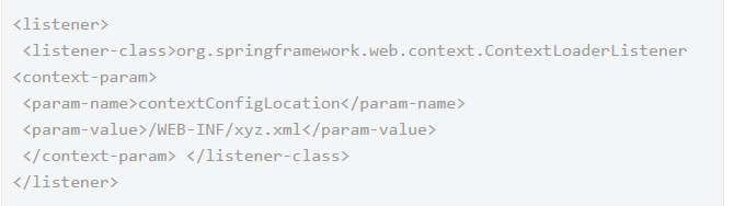 ContextLoaderListener是一个ServletContextListener,它在你的web应用启动的时候初始化。缺省情况下,它会在WEB-INF/applicationContext.xml文件找Spring的配置。你可以通过定义一个元素名字为”contextConfigLocation”来改变Spring配置文件的位置。示例如下: