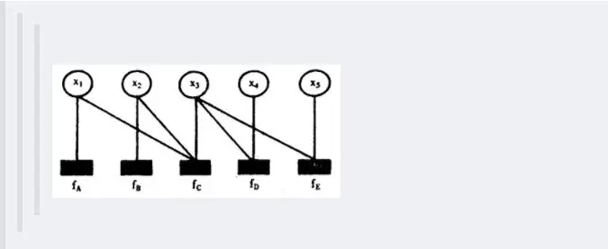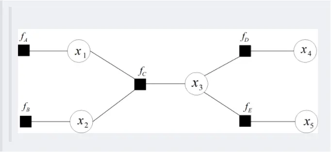 其中fA,fB,fC,fD,fE为各函数,表示变量之间的关系,可以是条件概率也可以是其他关系。其对应的因子图为: