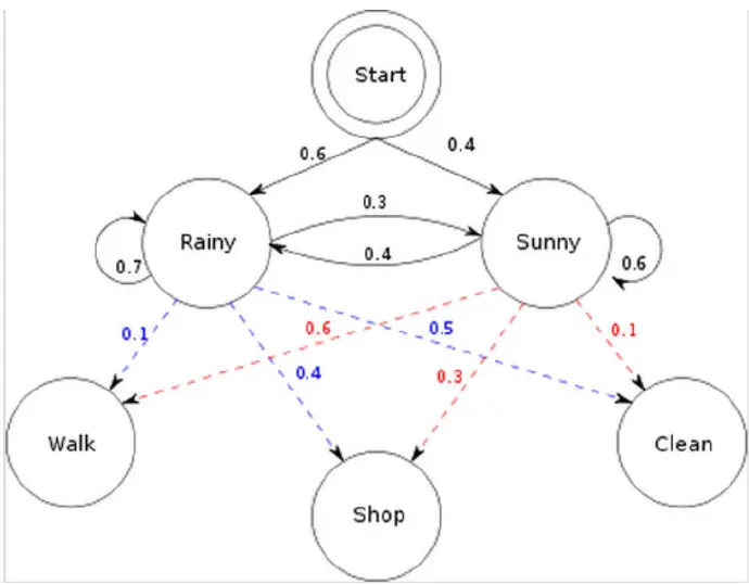 小明现在有三天的假期,他为了打发时间,可以在每一天中选择三件事情来做,这三件事情分别是散步、购物、打扫卫生(对应着可观测序列),可是在生活中我们所做的决定一般都受到天气的影响,可能晴天的时候想要去购物或者散步,可能下雨天的时候不想出门,留在家里打扫卫生。而天气(晴天、下雨天)就属于隐藏状态,用一幅概率图来表示这一马尔可夫过程: