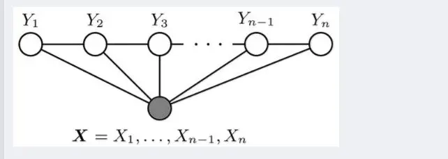 设X=(X1,X2…Xn)和Y=(Y1,Y2…Ym)都是联合随机变量,若随机变量Y构成一个无向图 G=(V,E)表示的马尔可夫随机场(MRF),则条件概率分布P(Y|X)称为条件随机场(Conditional Random Field, 简称CRF,后续新的博客中可能会阐述CRF)。如下图所示,便是一个线性链条件随机场的无向图模型: