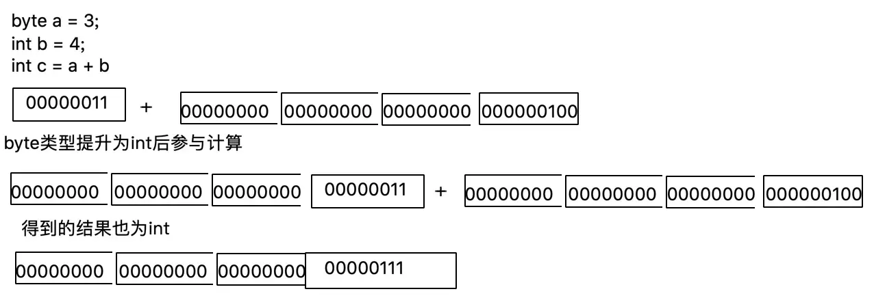 int类型,浮点型默认为double类型 byte、short、char类型在相互参与运算时会提升为int类型,返回也为int类型。- 如果参与运算的变量中有