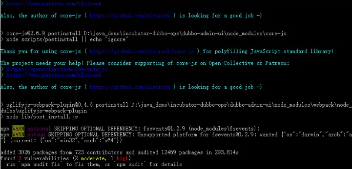 2)使用cd命令,进入文件dubbo-admin-ui目录,使用命令npm install,进行安装。安装完毕如下图所示。
