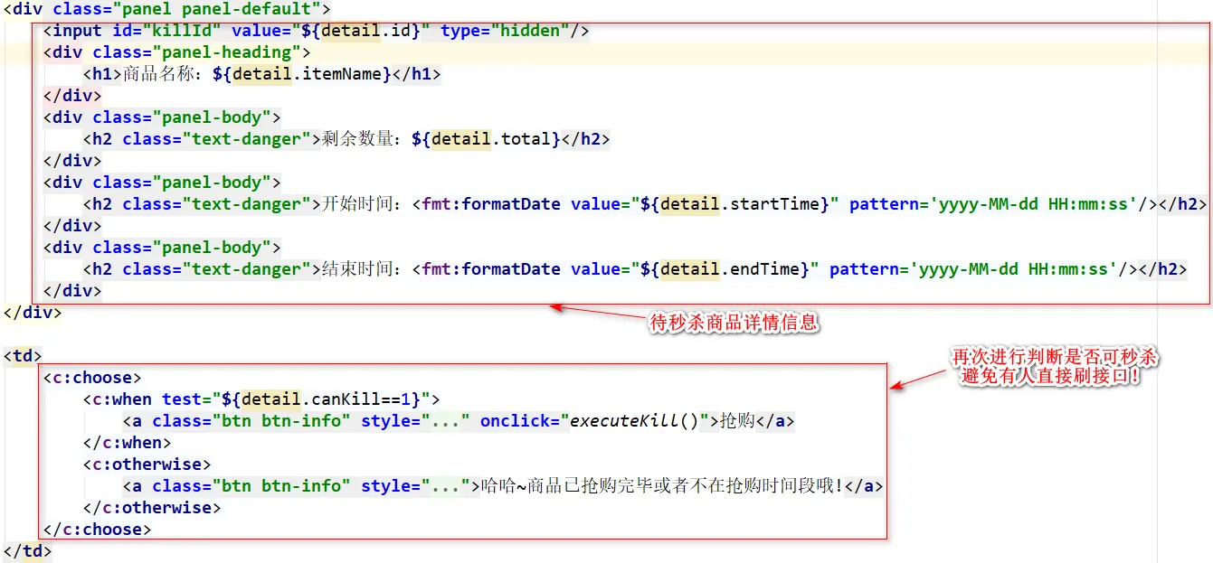 从该页面的部分核心源代码中可以看出,为了避免有人“跳过页面的请求,直接恶意刷后端接口”,在该页面仍然再次进行了一次判断(在后面执行“抢购/秒杀”请求时,后端接口还会再次进行判断的,所有这些都是为了安全考虑!)