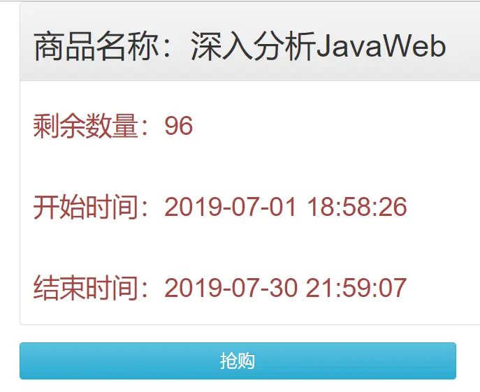 (4)至此,关于“待秒杀商品的详情展示”的功能的前后端代码实战已经完成了!再次将整个系统/项目运行在外置的tomcat服务器中,点击列表页中的“详情”按钮,可以看到待秒杀商品的详情信息,如下图所示: