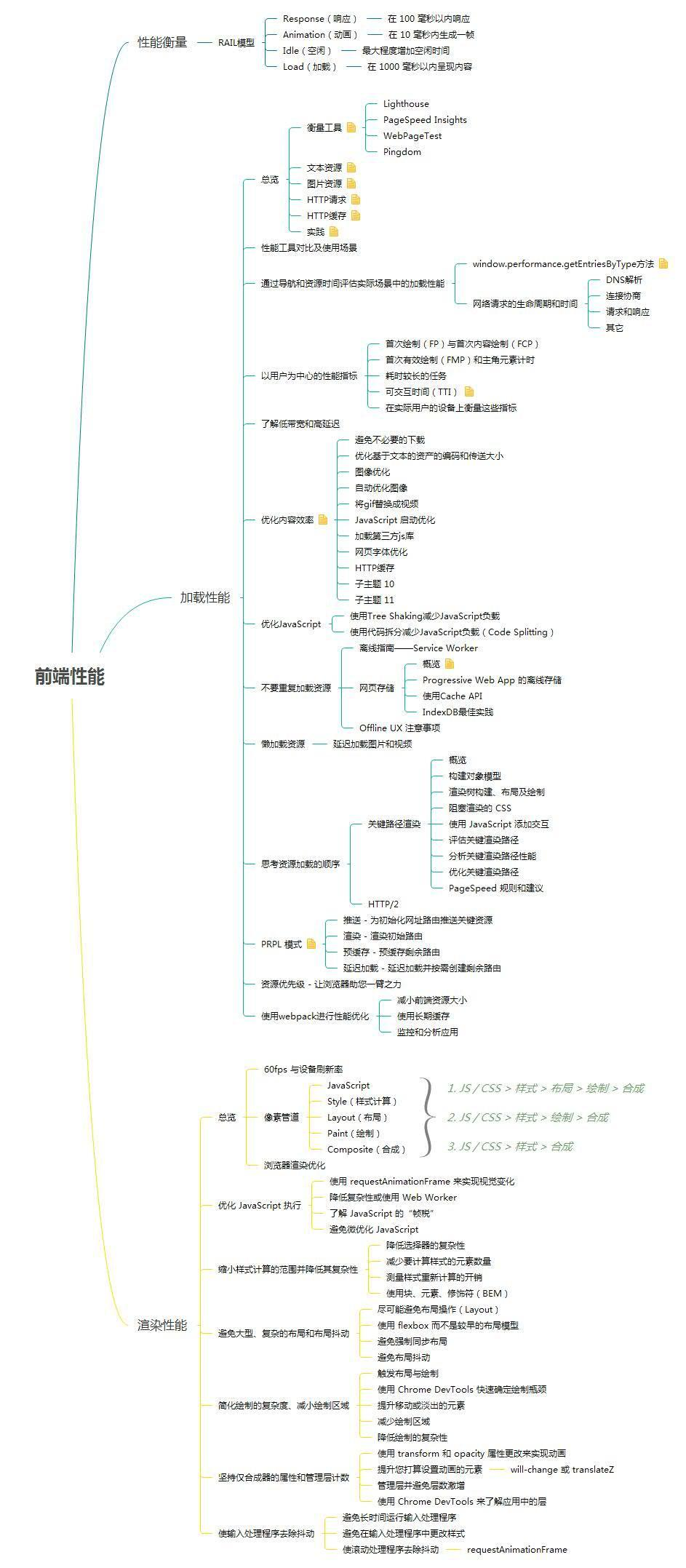 性能优化涉及的点比较多,我们经常能看到一些文章列举了多少条性能优化的点,但是这些优化手段的出发点是什么?怎么能有效地把它们串联起来,在实际项目中进行合理的运用呢?恩,官方文档 肯定是我们参考的依据,另外,思维导图也是个好东西。