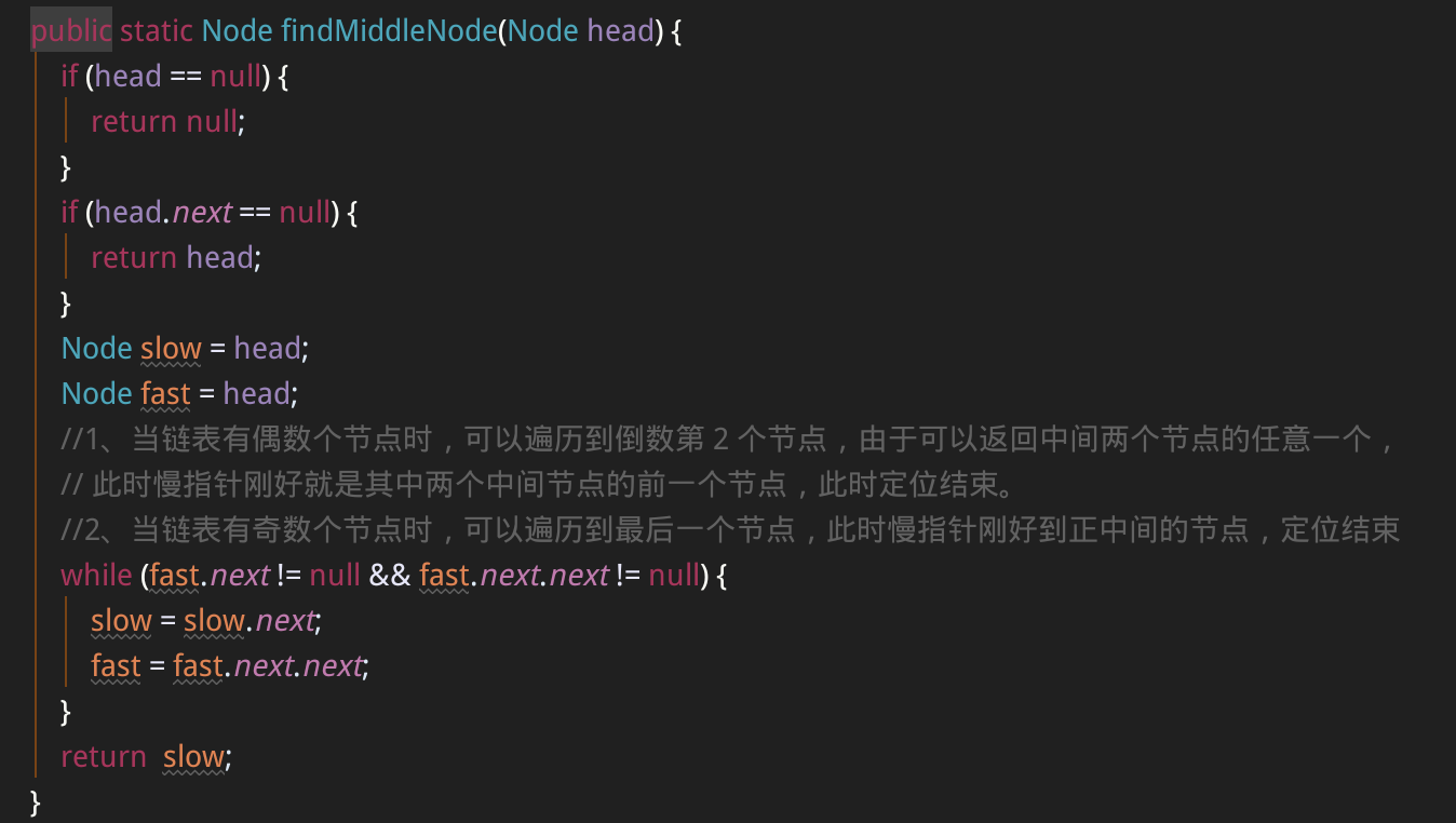 //2、当链表有奇数个节点时,可以遍历到最后一个节点,此时慢指针刚好到正中间的节点,定位结束