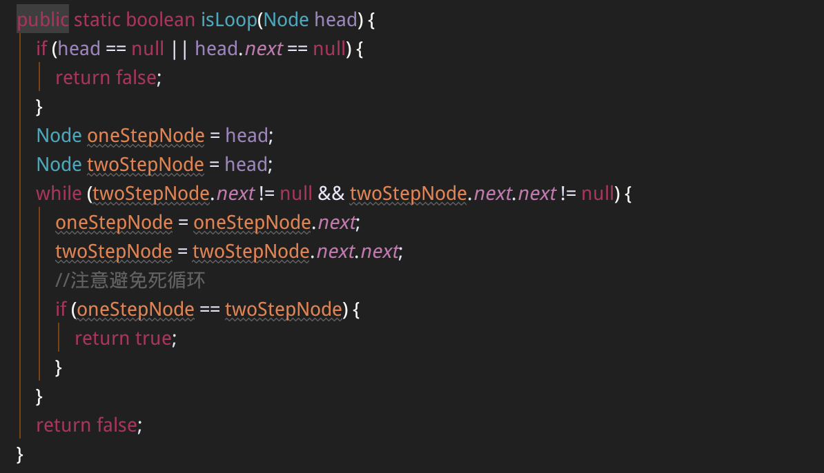 如果走得快的指针走到了链表末尾,即 next 为 null,则表明链表不存在环形结构。