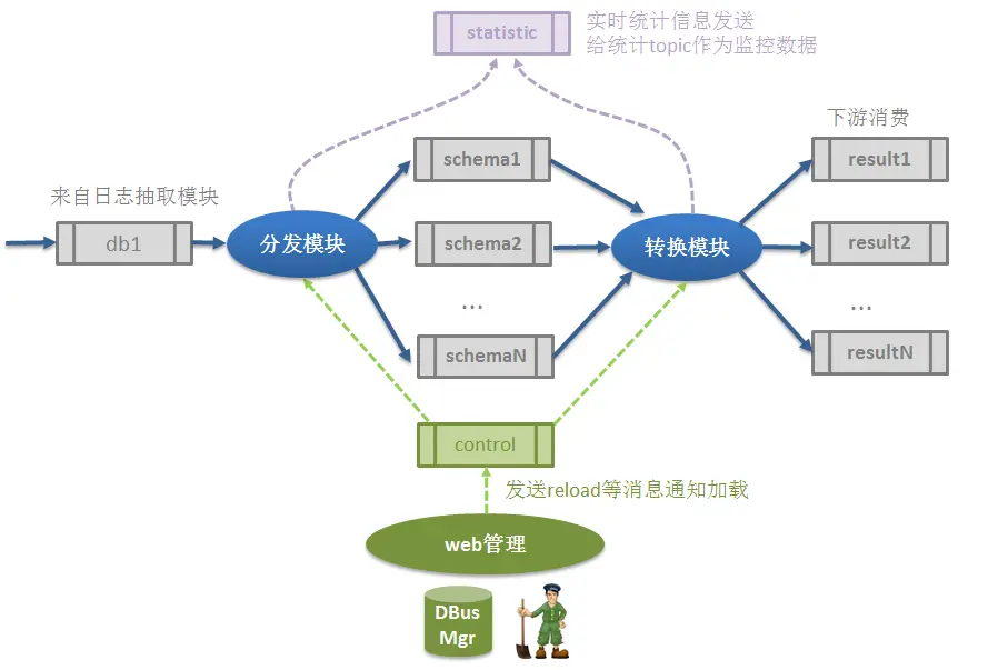 - 监控数据:分发模块和转换模块都会响应心跳event,统计每一张表在两次心跳中的数据和延时情况,发送到statistic作为监控数据使用。