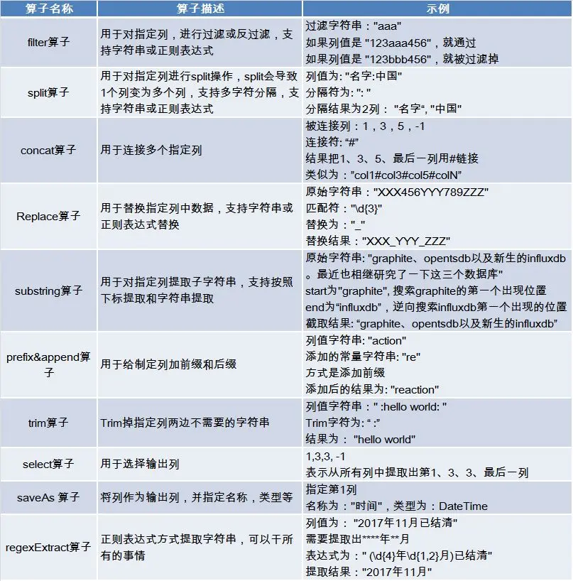 规则算子是对数据进行过滤、加工、转换的基本单元。常见的规则算子如下: