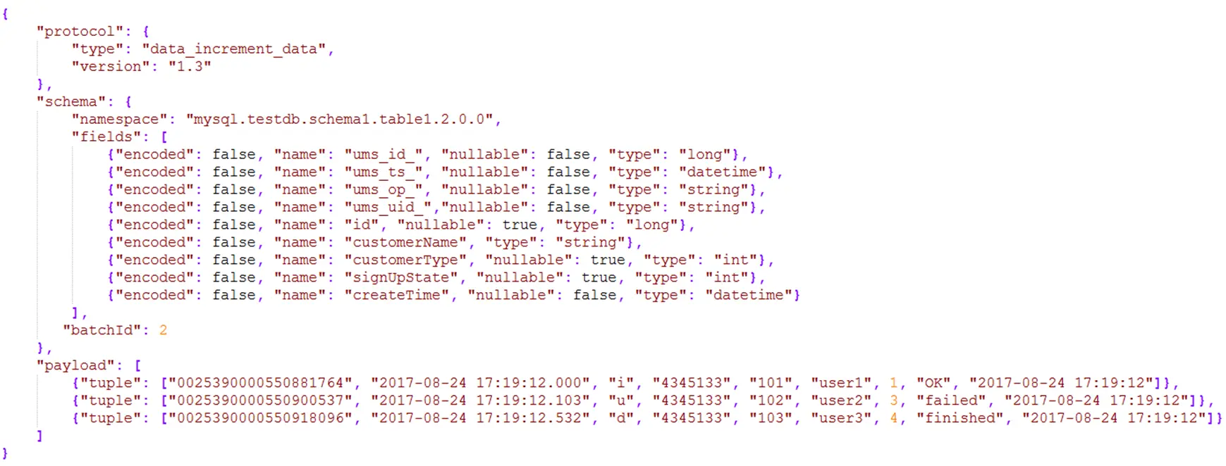 无论是增量、全量还是日志,最终输出到结果kafka中的消息都是我们约定的统一消息格式,称为UMS(unified message schema)格式。如下图所示: