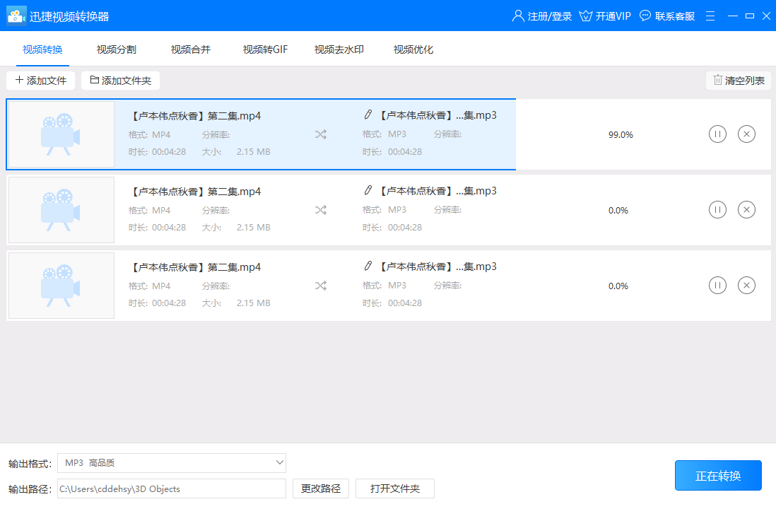 把mp4转换成mp3格式,很明显,mp4是视频格式,mp3是音频格式,视频转音频!还可以说成是提取视频中的音频或声音,其实这种需求在用户当中还是有一些的,比如需要提取某部电脑里面某段声音,去掉视频的画面只需要音频,等等,下载视频格式转换器即可实现把mp4转换成mp3音乐格式。并且还可以通过提取时转换设置音频的质量,很强大吧,赶紧下载视频转音频软件吧!