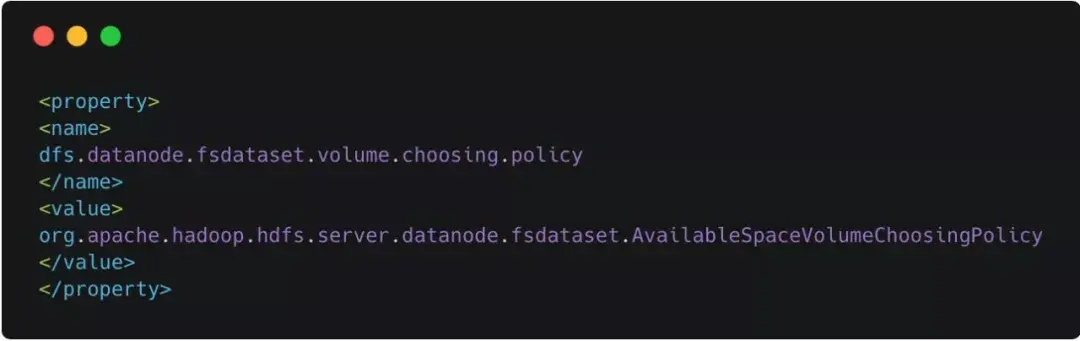 如果不配置,默认使用第一种方式,既轮询选择磁盘来存储数据副本,但是轮询的方式虽然能够保证所有磁盘都能够被使用,但是经常会出现各个磁盘直接数据存储不均衡问题,有的磁盘存储得很满了,而有的磁盘可能还有很多存储空间没有得到利用,所有在hadoop2.0集群中,最好将磁盘选择策略配置成第二种,根据磁盘空间剩余量来选择磁盘存储数据副本,这样一样能保证所有磁盘都能得到利用,还能保证所有磁盘都被利用均衡。