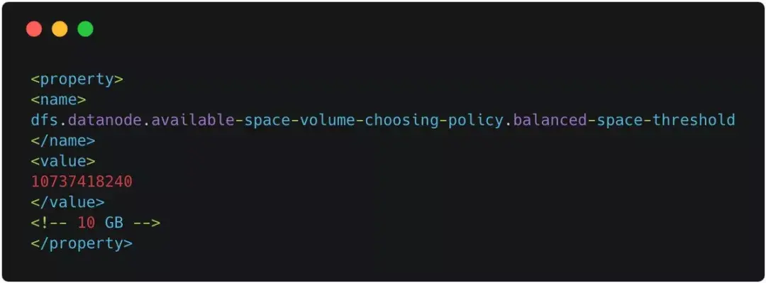 默认值是10737418240,既10G,一般使用默认值就行。官方解释为,首先计算出两个值,一个是所有磁盘中最大可用空间,另外一个值是所有磁盘中最小可用空间,如果这两个值相差小于该配置项指定的阀值时,则就用轮询方式的磁盘选择策略选择磁盘存储数据副本。