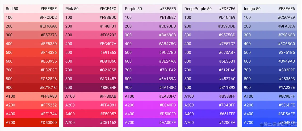 颜色系统是通过 Material 的官方色值用 sass 生成的,Material 的颜色定义如下,包括主体色值以及对应的对比色值:
