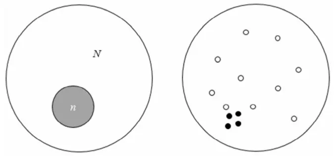 这个区别的原因在于, 用样本方差估计总体方差总是有一定的偏差存在。 如果从总体中抽取的样本个案(数值) 刚好均匀分布在总体均值μ的四周,如下图(左)中的白点,那么将样本方差公式的分母改为n,也将是总体方差的良好估计; 如果抽取的样本个案聚集在总体均值的一侧, 如下图(右) 中的黑点,那么分母为n的样本方差将会小于总体方差, 显然是总体方差的有偏估计。