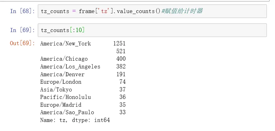 frame.info()#使用info查看frame函数的基础数据特性信息tz_counts = frame['tz'].value_counts()#赋值给计时器