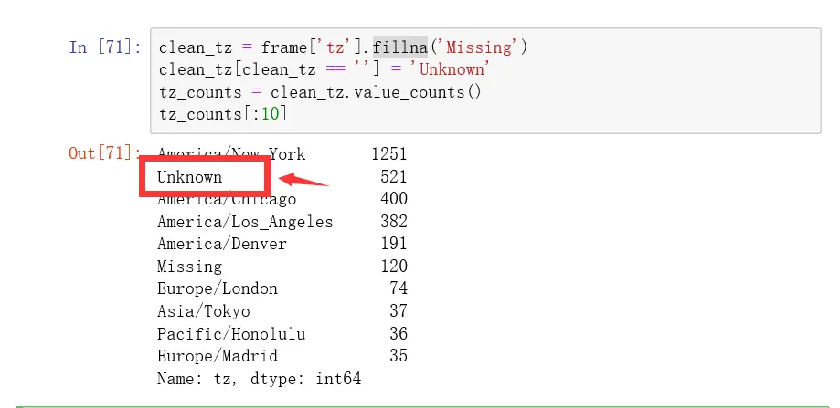 clean_tz[clean_tz == ''] = 'Unknown'