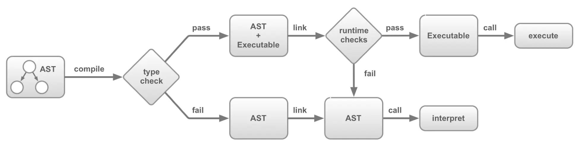 当浏览器获取到.wasm文件(二进制),JS引擎将使用解码栈解码,将wasm文件转换为AST,执行类型检查,并将其解释为执行函数。示例图: