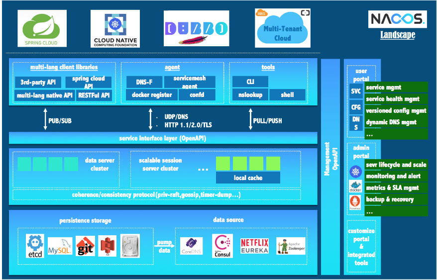 如 Nacos 全景图所示,Nacos 无缝支持一些主流的开源生态,例如