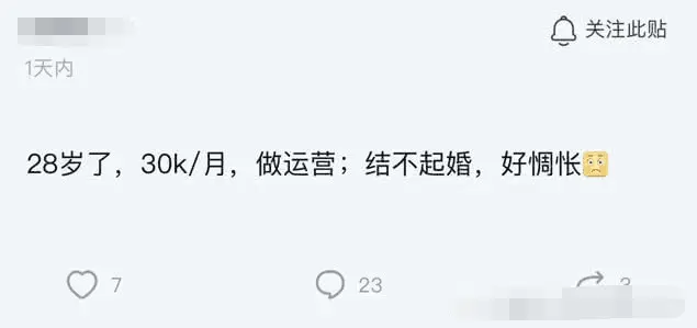 在很多人眼里像程序员这样的职业应该算是一份不错的工作,毕竟这样的工作对技术要求很高,因此有着不少的薪水,而有着高薪水的话,找对象应该也是不难的,但是下面这位程序员却表示自己月薪三万,但是却结不起婚,感觉未来一片灰暗,这究竟是怎么一回事呢?