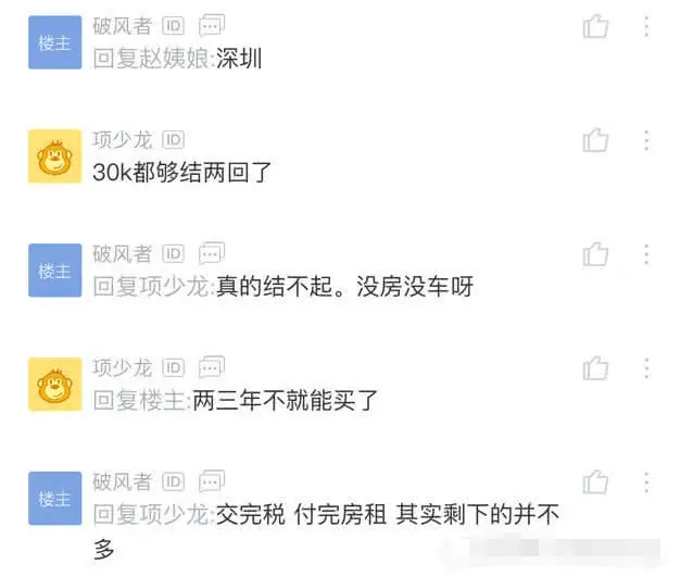 网友一:结不起婚也是正常的,现在的女生一个个要求都很高,深圳这样的大城市更是如此,再加上女生又从小都是被父母宠大的,找对象的眼光非常挑剔。三万可能在一些小城市里算是不错的收入了,但是在大城市里这样的收入可能只能算是标准水平,大多数的女生都被电视剧和电影里的情节所迷惑,幻想着能有王子看上她们,在这样的情况下,项先生能有烦恼也是正常的。