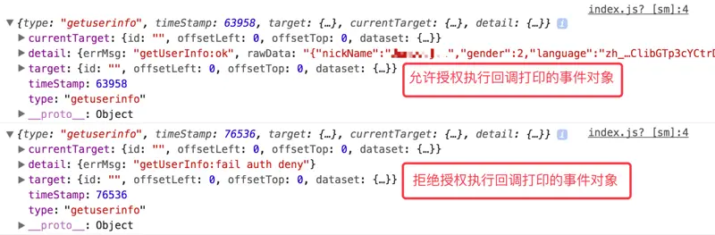 展开用户在弹框中进行了允许的操作执行的事件回调打印出来的信息可以看到: