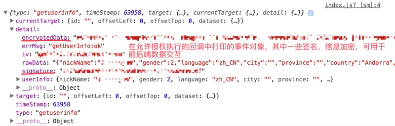 其中也可以看到,e.detail.userInfo为用户的一些基本信息。