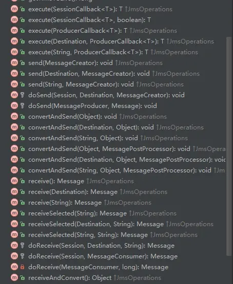 Spring针对JDBC,JMS,JPA等规范,都提供了相应的模板方法类,如JdbcTemplate,JmsTemplate, JpaTemplate。 例如JdbcTemplate,它提供了很多常用的增加,删除,查询,修改方法模板。而JMSTemplate则提供了对于消息的发送,接收方法等。下面是JMSTemplate的部分方法图