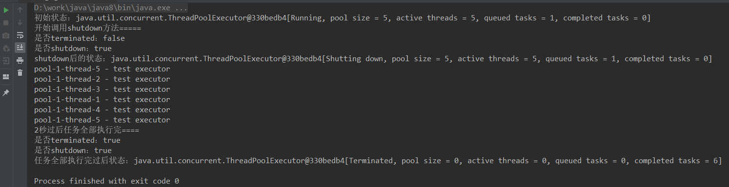 两秒后任务执行完毕:线程池已关闭(terminated为true),调用了shutdown(不再接收新任务),6个完成任务