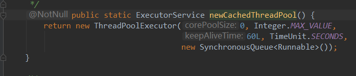 容量管理策略:如果线程池中的线程数量不满足任务执行,创建新的线程。每次有新任务无法即时处理的时候,都会创建新的线程。当线程池中的线程空闲时长达到一定的临界值(默认60秒),自动释放线程,这里通过Executors.newCachedThreadPool()方法得到的线程池无法修改空闲时间,具体原因见下图,但可以通过自定义线程池ThreadPoolExecutor修改,具体方法见2.5,这里就不解释了