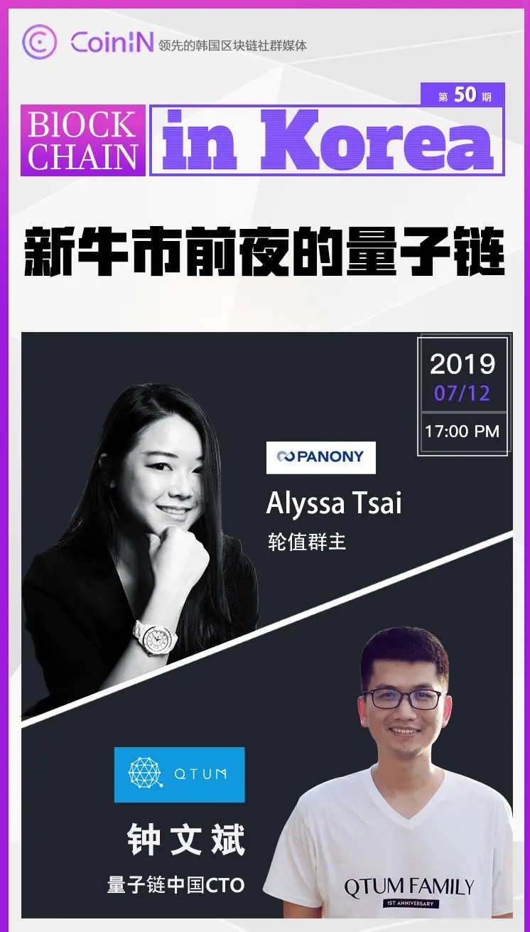 面对变幻莫测的市场,Qtum量子链如何在技术上深耕,突出重围?Qtum未来技术方向是什么?为什么要布局隐私与跨链方向?如何看待目前的区块链市场?带着这些疑问,7月12日,由Coinin推出韩国首档大咖社群访谈节目《Blockchain-in-Korea》,PANONY创始人兼CEO Alyssa Tsai与Qtum量子链中国CTO钟文斌发起线上AMA。