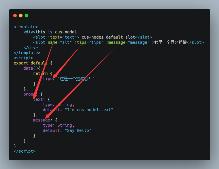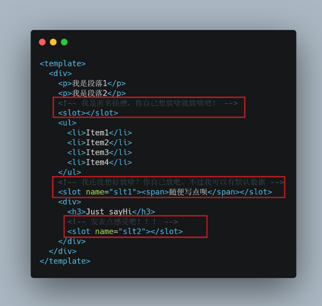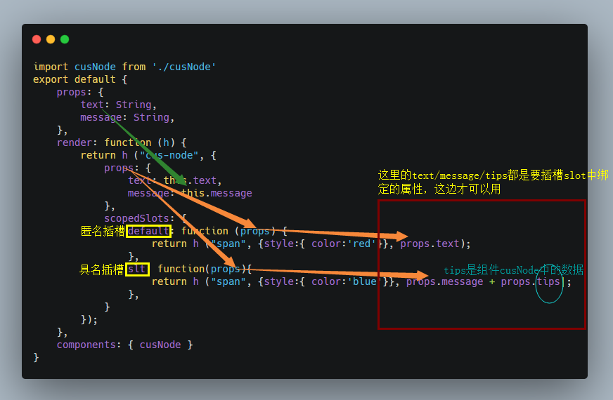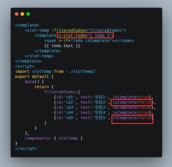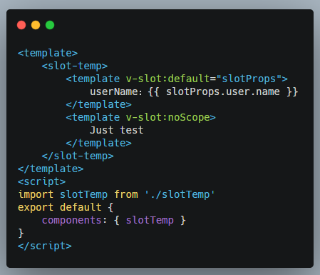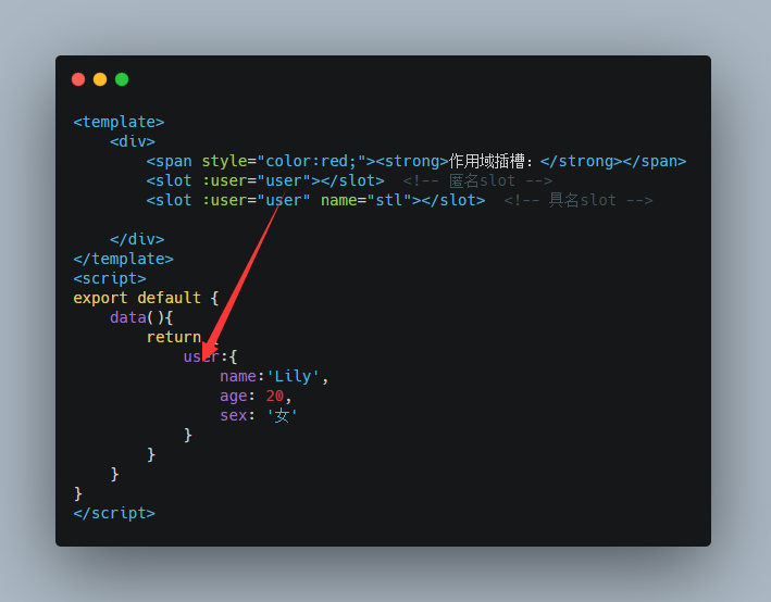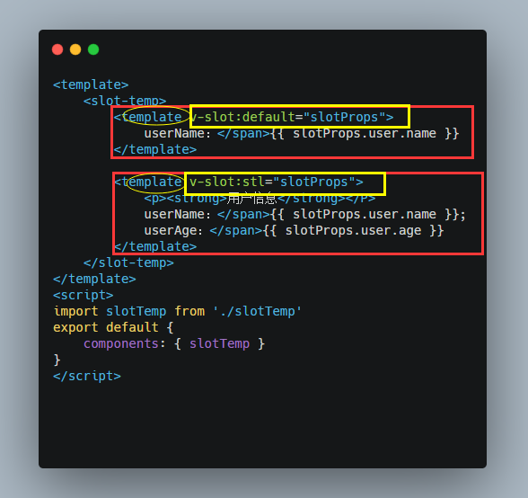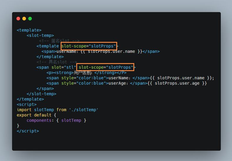 可以直接写成slot-scope="{user}",若slot中绑定了多个属性,如除了user,还有title,则可以写成slot-scope="{user, title}";调用的时候直接user.name即可。
