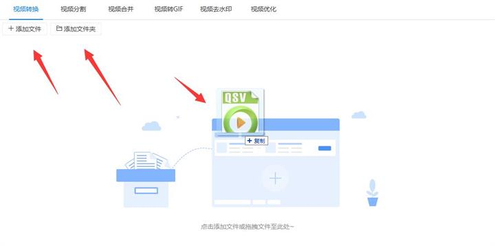 2、把爱奇艺的qsv格式的文件添加到软件中,添加的时候可以点击软件左上角的“添加文件”或“添加文件夹”按钮,如果不想点击软件左上角的按钮也可以直接把视频拖拽到软件中。拖拽时也支持同时添加多个文件或文件夹提高添加视频的效率。