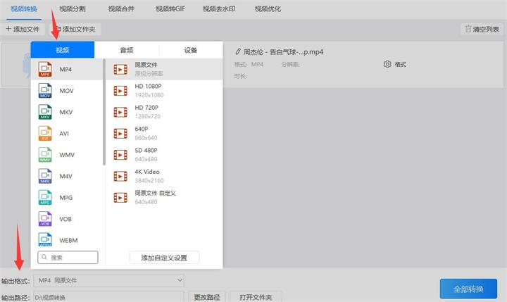 3、设置“输出格式”,输出格式又分为视频格式和视频分辨率。因为我们需要把qsv格式转换成mp4格式,所以把视频格式设置为‘mp4’格式,分辨率尽量设置为和原视频相同分辨率的‘同原文件’分辨率。