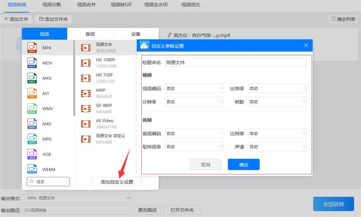 4、如果不想把“输出格式”设置为‘mp4同原文件’格式或者其它软件预设格式,可以根据各自需求点击“添加自定义设置”对‘视频’下的视频编码、比特率、分辨率和帧数,或‘音频’下的音频编码、比特率、取样频率和声道设置不同的参数以满足需求。