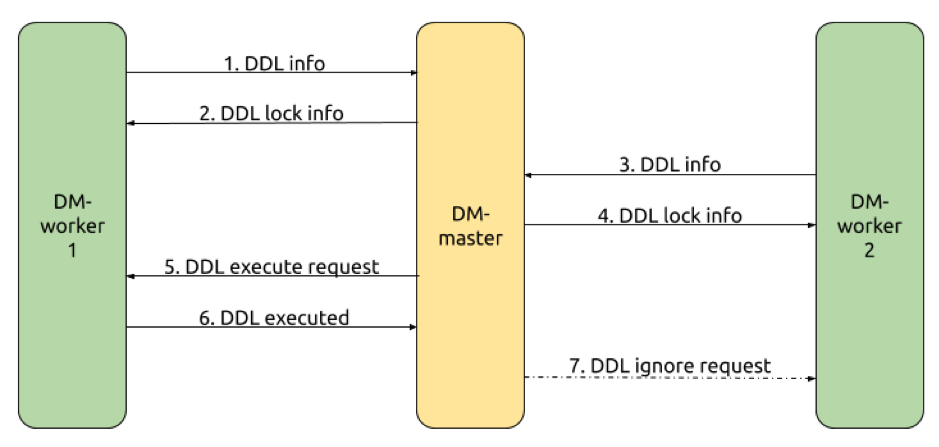 我们基于在 这篇文章 中展示过的仅包含两个 DM-worker 的 shard DDL 协调流程示例(如下图)来了解 DM 内部的具体实现。
